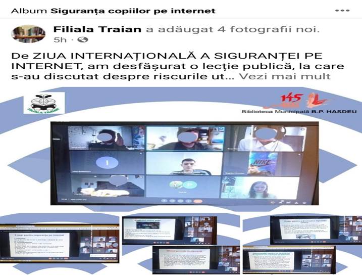 De Ziua Internațională a  Siguranței pe Internet, elevii clasei a IV-a ,,B”, învățător Nimerenco Liliana, a IV-a ,,C”, învățător Știrbu Minodora și elevii claseia IV-a,,D”, învățător Cociug Maria, au desfășurat o lecție publică online în parteneriet cu Filiala Traian, în cadrul căreia au discutat despre riscurile utilizării internetului prin plasarea conținutului cu caracter personal; explorarea sigură a Internetului; riscurile de contact și conduită în mediul virtual.