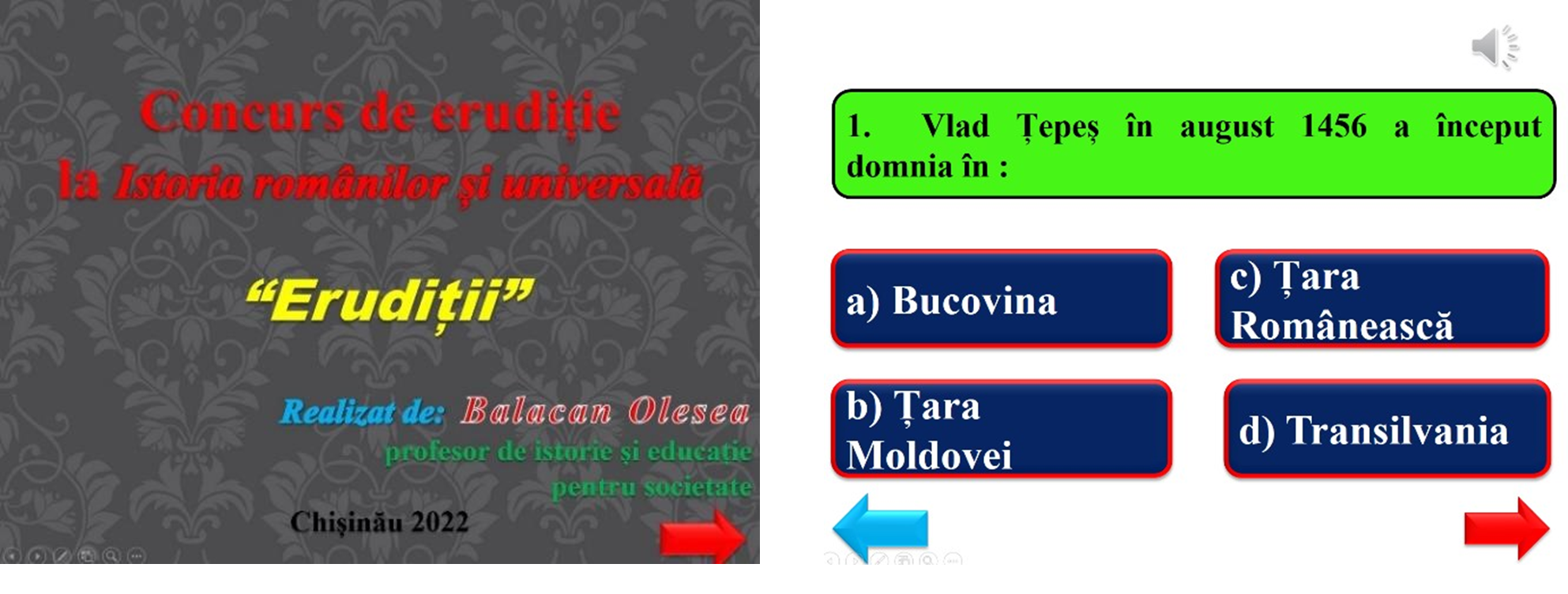 Premianții concursului: Bacal Evelina clasa XI-a „A” și Cojocari Gabriel clasa X-a „A” CONCURSUL INTELECTUAL: „Erudiții”, moderator Balacan Olesea