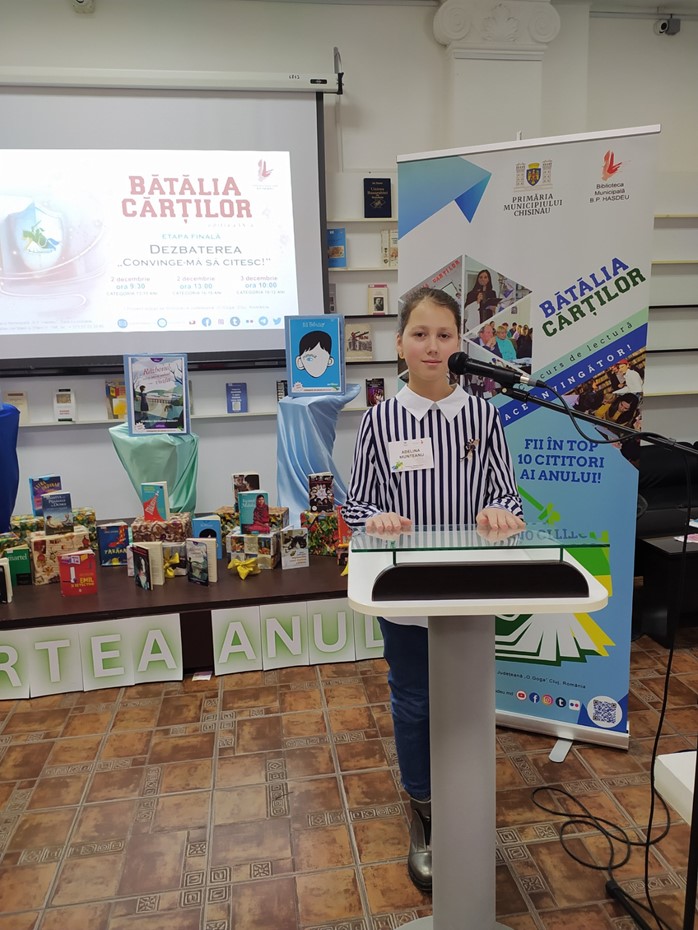 La această etapă a concursului, au ajuns trei elevi sârguincioși ai instituției noastre: Munteanu Adelina, elevă în clasa a VI-a „B” (profesoară Bătrîn Rodica), Lungu Valeria, elevă în cl. a VII-a „A” (prof. Parașciuc Elena) și Lungu Sebastian, elev în cl. a IX-a „A” (prof. Parașciuc Elena). Participanții au lecturat șapte cărți (specificate în regulamentul concursului), au îndeplinit cu rigurozitate fișele de lectură pentru fiecare operă literară. Fișele elevilor au fost verificate de către membrii juriului printre care:
