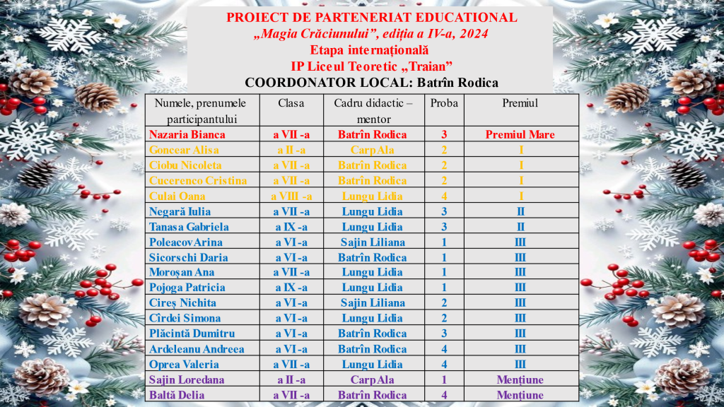 Suntem mândri să transmitem cele mai călduroase urări de succes elevilor din IP Liceul Teoretic „Traian” pentru contribuțiile lor creative și eforturile remarcabile depuse în cadrul Proiectului Educațional-Concurs Magia Crăciunului, 2024. Participarea voastră este o adevărată dovadă a talentului, pasiunii și dedicării care definesc comunitatea noastră școlară!