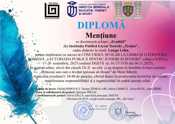 Astfel, în ziua de 19 noiembrie, miercuri, la ora 15.00, on-line, s-a desfășurat concursul, Categoria a III-a pentru elevii claselor a IX-a – a X-a. Un grup de zece discipoli din clasa a X-a „C” – echipa „Erudiții” – ghidați de profesoara de Limba și literatura română, Lungu Lidia, au participat la această etapă, răspunzând la un șir de întrebări din diverse dicipline școlare, în baza biografiei romanțate a scriitoarei române, Moni Stănilă, „Brâncuși sau cum a învățat țestoasa să zboare”, după cum urmează: